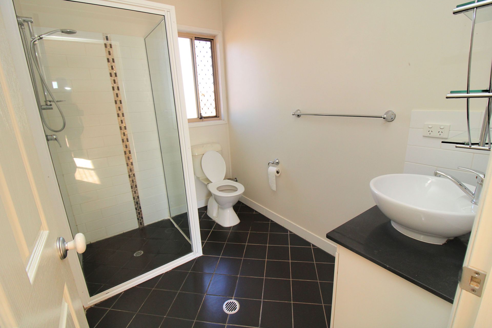 The Master has a roomy ensuite with dark tiles and a standing shower. The main family bathroom has a bath tub, standing shower and separate toilet.